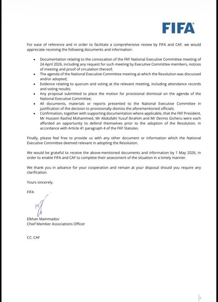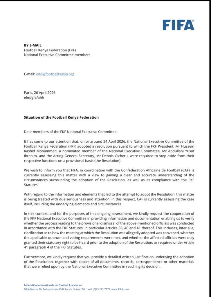 In a letter addressed to FKF NEC members, FIFA says it became aware of a resolution reportedly passed on or around April 24th, 2026, requiring the three officials to “step aside from their respective functions on a provisional basis.”