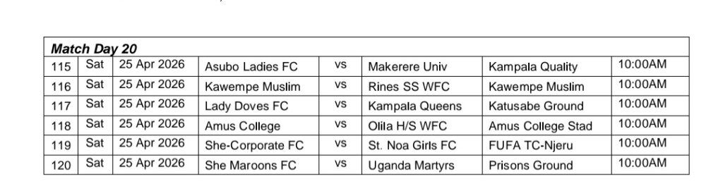 Federation of Uganda Football Associations (FUFA) has adjusted the FUFA Women’s Super League fixtures for matchday 20.