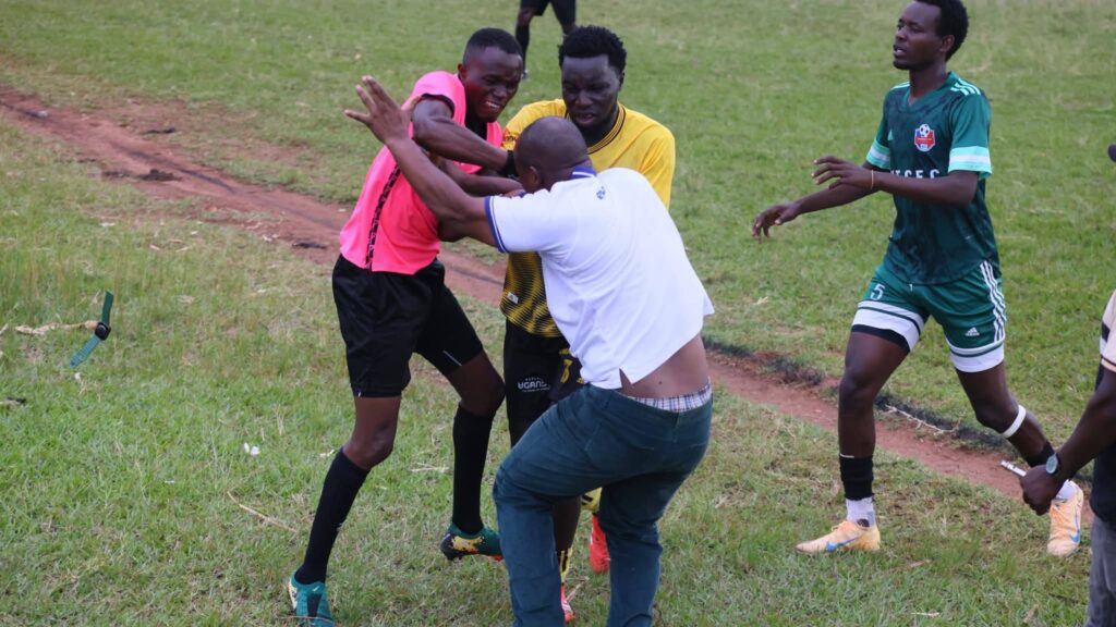 According to match officials’ reports, two identified home fans, Mbaliire Khalid and Kawooya, assaulted the assistant referee, triggering further chaos and pitch invasion by spectators.